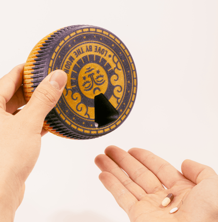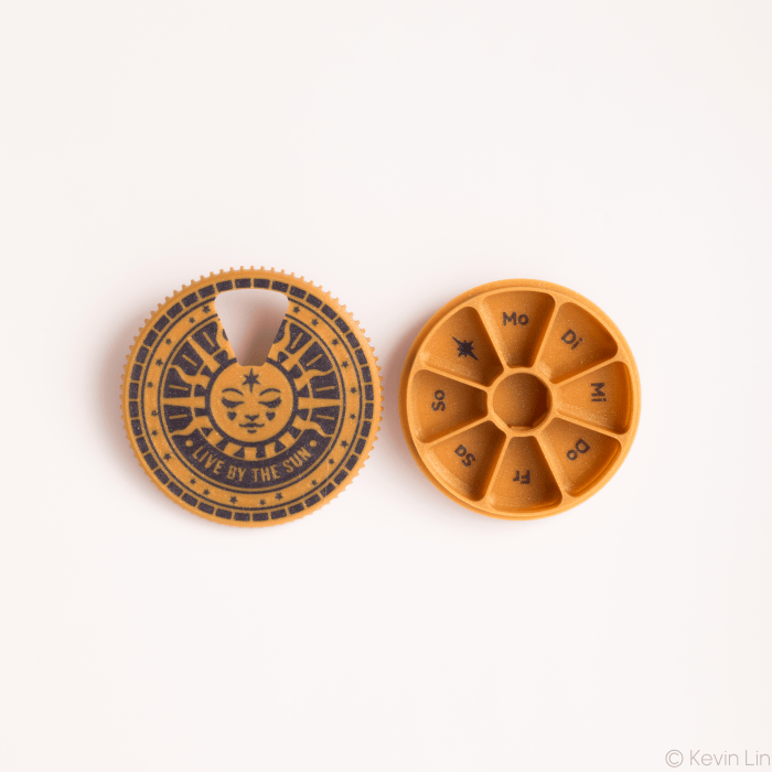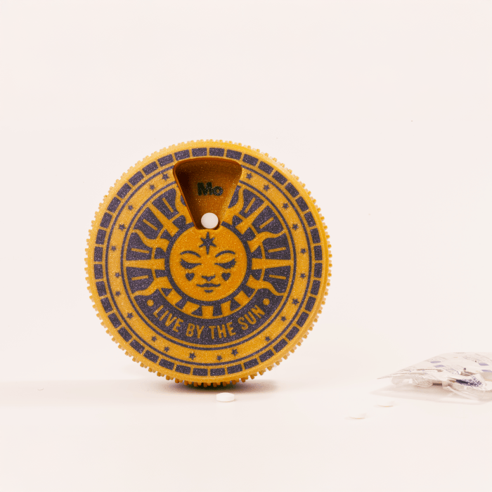 Keep your pills and vitamins organized with this celestial 7-day system featuring Sun (AM) & Moon (PM) sides. 8 secure click-lock slots, perfect for travel or daily use.