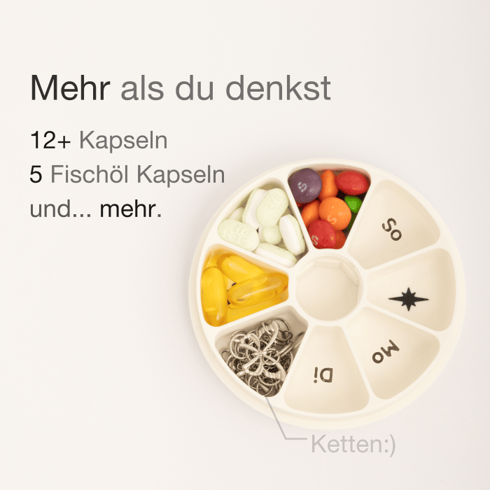 Ideal für Supplements, Tabletten, Gummies und komplexe Kombinationen über 7 Tage hinweg.